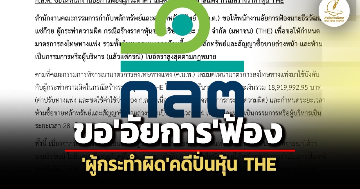 ‘ก.ล.ต.’ ทำหนังสือถึง ‘พนักงานอัยการ’ ขอให้ดำเนินคดี ‘ธีรวัฒน์ แซ่ก๊วย’ ผู้กระทำความผิด กรณีสร้างราคาหุ้น THE หลังไม่ยอมชำระค่าปรับทางแพ่ง 18 ล้าน