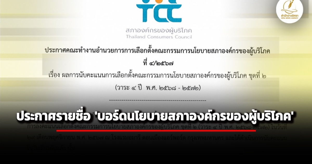 ตามที่คณะทำงานอำนวยการการเลือกตั้งคณะกรรมการนโยบายสภาองค์กรของผู้บริโภคได้จัดให้มีการลงคะแนนเลือกตั้งคณะกรรมการนโยบายสภาองค์กรของผู้บริโภค ชุดที่ 2 (วาระ 4 ปี พ.ศ.2568 - 2572) ในวันที่ 29 เดือนพฤศจิกายน พ.ศ. 2567 ณ โรงแรมอมารี ดอนเมืองแอร์พอร์ต กรุงเทพมหานคร และได้ดำเนินการนับคะแนนในวันเดียวกันแล้ว นั้น