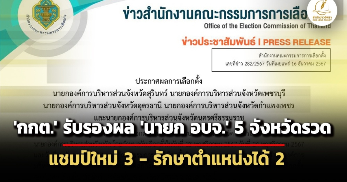 สำนักข่าวอิศรา (www.isranews.org.) รายงานว่า วันที่ 16 ธันวาคม 2567 สำนักงานคณะกรรมการการเลือกตั้ง (กกต.) เผยแพร่ข่าว กกต. ประกาศผลการเลือกตั้งนายกองค์การบริหารส่วนจังหวัด (อบจ.) จำนวน 5 จังหวัด ได้แก่ นางธัญพร มุ่งเจริญพร นายก อบจ.สุรินทร์ นายชัยยะ อังกินันทน์ นายก อบจ. เพชรบุรี นายศราวุธ เพชรพนมพร นายก อบจ. อุดรธานี นายสุนทร รัตนากร นายก อบจ.กำแพงเพชร นางสาววาริน ชิณวงศ์ นายก อบจ.นครศรีธรรมราช โดยมีรายละเอียดดังนี้