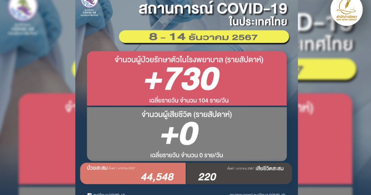 สำนักข่าวอิศรา (www.isranews.org) รายงานสถานการณ์แพร่ระบาดของโรคโควิด-19 ประเทศไทย ประจำสัปดาห์ ระหว่างวันที่ 8 - 14 ธ.ค. 2567 มีจำนวนผู้ติดเชื้อใหม่เข้ารักษาตัวโรงพยาบาล 730 ราย เฉลี่ยวันละ 104ราย ทำให้จำนวนผู้ติดเชื้อสะสมอยู่ที่ 44,548 ราย (ตั้งแต่ 1 ม.ค. 2567)
