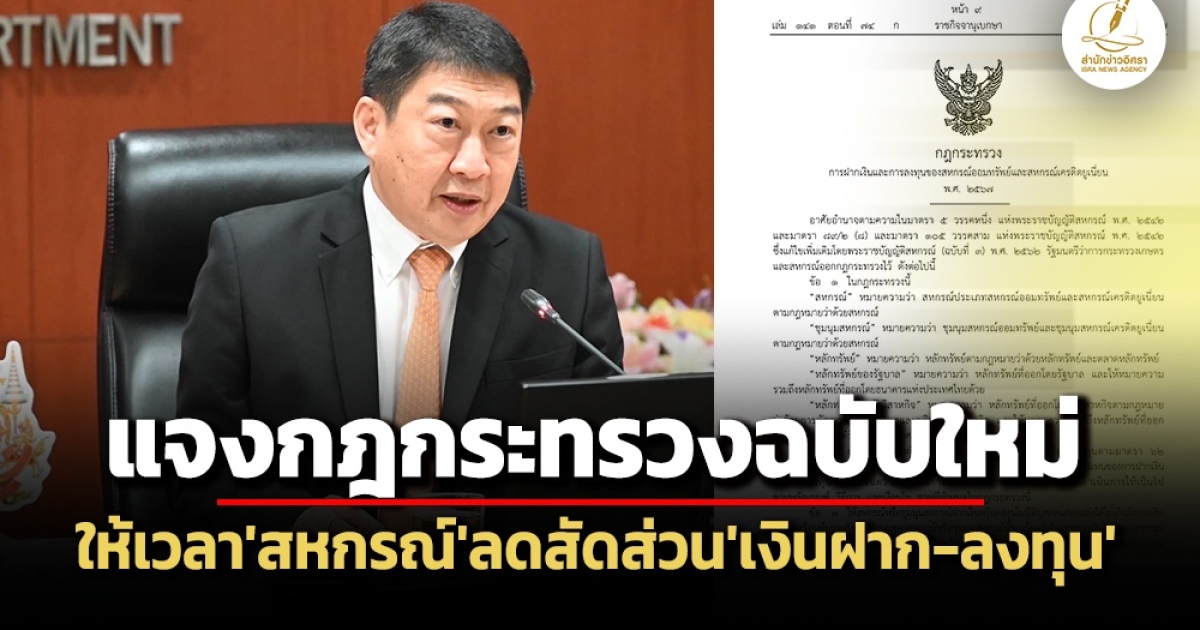 จากกรณีที่เมื่อวันที่ 26 พ.ย.ที่ผ่านมา เว็บไซต์ราชกิจจานุเบกษาได้ประกาศกฎกระทรวงการฝากเงินและการลงทุนของสหกรณ์ออมทรัพย์และสหกรณ์เครดิตยูเนี่ยน พ.ศ.2567 ซึ่งกำหนดหลักเกณฑ์เกี่ยวกับเรื่องการฝากเงินและการลงทุน สำหรับสหกรณ์และชุมนุมสหกรณ์มีสภาพคล่องทางการเงินสูงและมีการลงทุนตามมาตรา 62 โดยกำหนดให้สหกรณ์ฯ สามารถฝากหรือลงทุนนิติบุคคลต่อแห่งได้ไม่เกิน 10% ของทุนเรือนหุ้นบวกทุนสำรองของสหกรณ์นั้นๆ นั้น