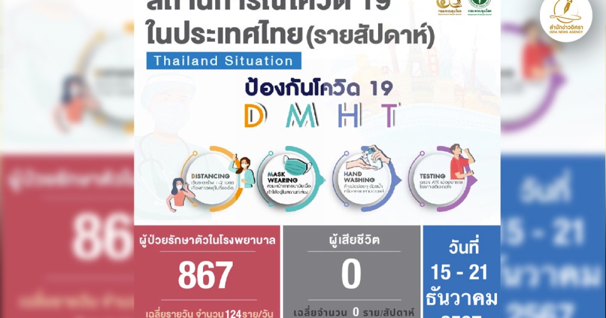 สถานการณ์โควิดไทย สัปดาห์ล่าสุด 15 - 21 ธ.ค. 2567 ติดเชื้อเข้ารักษาใน รพ.ใหม่ 867 ราย เฉลี่ย 124/วัน ไม่มีผู้เสียชีวิตเพิ่ม