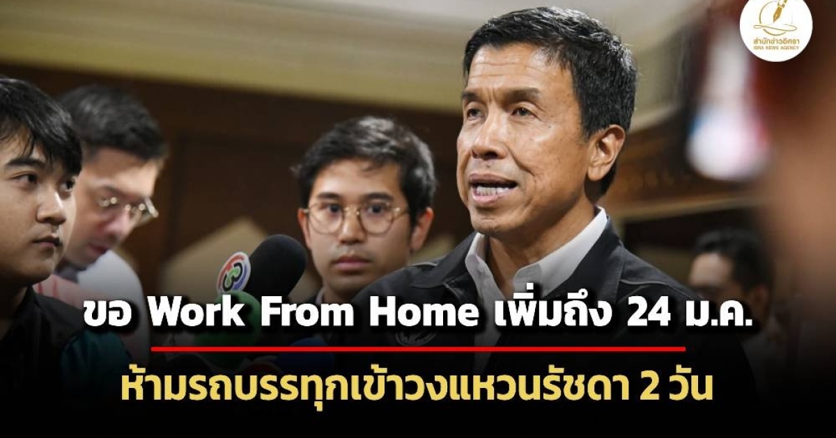 ฝุ่น PM2.5 ยังแรง ผู้ว่ากทม.ขยายมาตรการขอความร่วมมือ Work From Home ถึง 24 ม.ค.นี้ พร้อมสั่งให้รถบรรทุกขนาดใหญ่ห้ามเข้าเขตวงแหวนรัชดา 2 วัน 23-24 ม.ค.นี้ คาดสถานการณ์ฝุ่นผ่อนคลายช่วงสุดสัปดาห์นี้