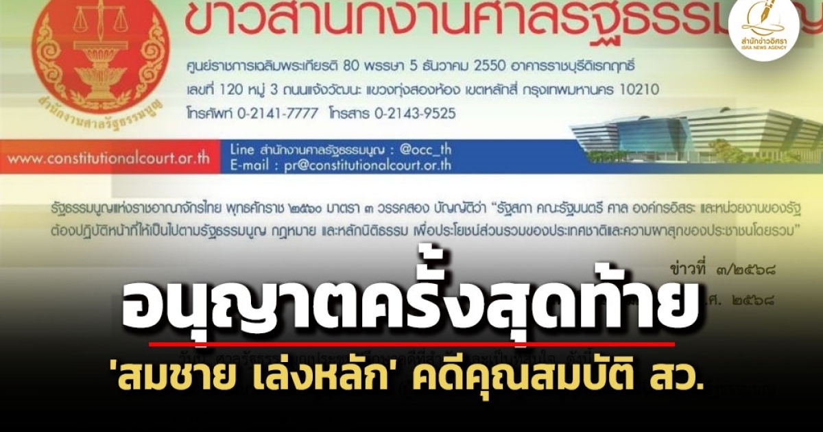 ศาลรัฐธรรมนูญ อนุญาต สมชาย เล่งหลัก ขอขยายระยะเวลายื่นคำชี้แจงแก้ข้อกล่าวหาเป็นครั้งสุดท้ายออกไปถึงวันที่ 13 ก.พ. 2568 หลังขอขยายมาแล้ว 3 ครั้ง กรณีคณะกรรมการการเลือกตั้ง ส่งคำร้องวินิจฉัยพ้นสมาชิกภาพวุฒิสภา หลังศาลฎีกา พิพากษาเพิกถอนสิทธิรับเลือกตั้ง 10 ปี