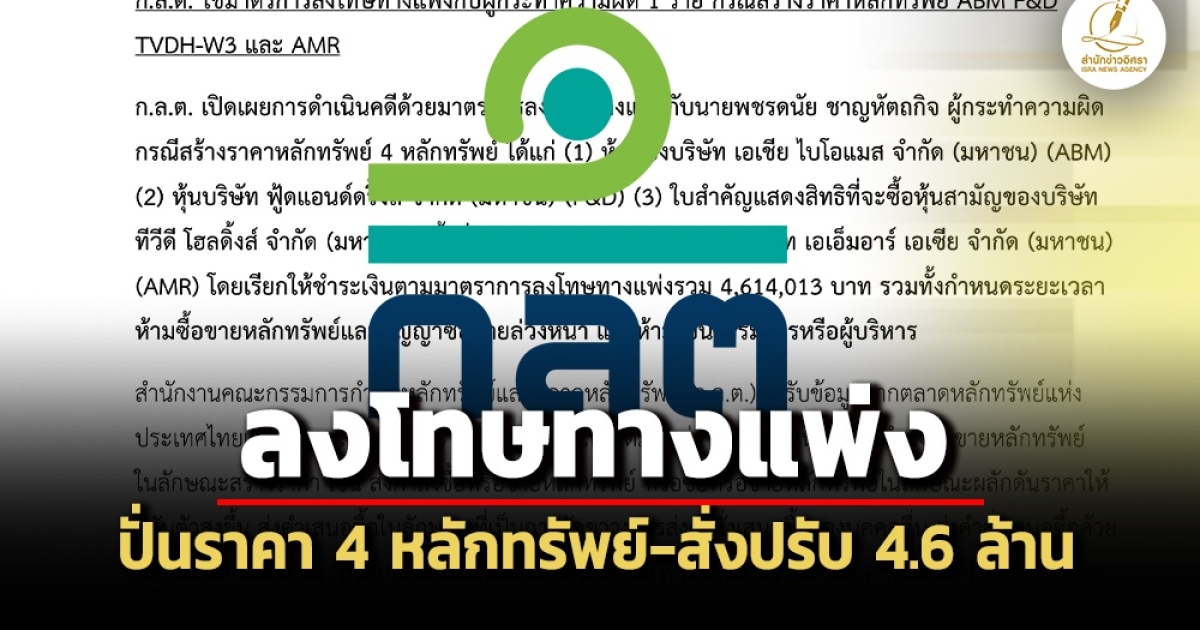 และ (4) หุ้นบริษัท เอเอ็มอาร์ เอเซีย จำกัด (มหาชน) (AMR) โดยเรียกให้ชำระเงินตามมาตราการลงโทษทางแพ่งรวม 4,614,013 บาท รวมทั้งกำหนดระยะเวลาห้ามซื้อขายหลักทรัพย์และสัญญาซื้อขายล่วงหน้า และห้ามเป็นกรรมการหรือผู้บริหาร