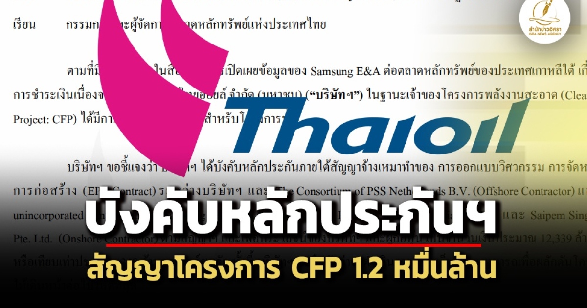 สำนักข่าวอิศรา (www.isranews.org) รายงานว่า เมื่อวันที่ 24 ม.ค.ที่ผ่านมา บริษัท ไทยออยล์ จำกัด (มหาชน) หรือ TOP แจ้งตลาดหลักทรัพย์ฯ เกี่ยวกับโครงการพลังงานสะอาด (Clean Fuel Project: CFP) ตามที่ปรากฏเป็นข่าวในสื่อ โดยมีเนื้อหาว่า ตามที่มีข่าวปรากฏในสื่อ เรื่องการเปิดเผยข้อมูลของ Samsung E&A ต่อตลาดหลักทรัพย์ของประเทศเกาหลีใต้ เกี่ยวกับการชำระเงิน เนื่องจากการที่บริษัท ไทยออยล์ จำกัด (มหาชน) ในฐานะเจ้าของโครงการพลังงานสะอาด (Clean Fuel Project: CFP) ได้มีการบังคับหลักประกันสำหรับโครงการฯ นั้น