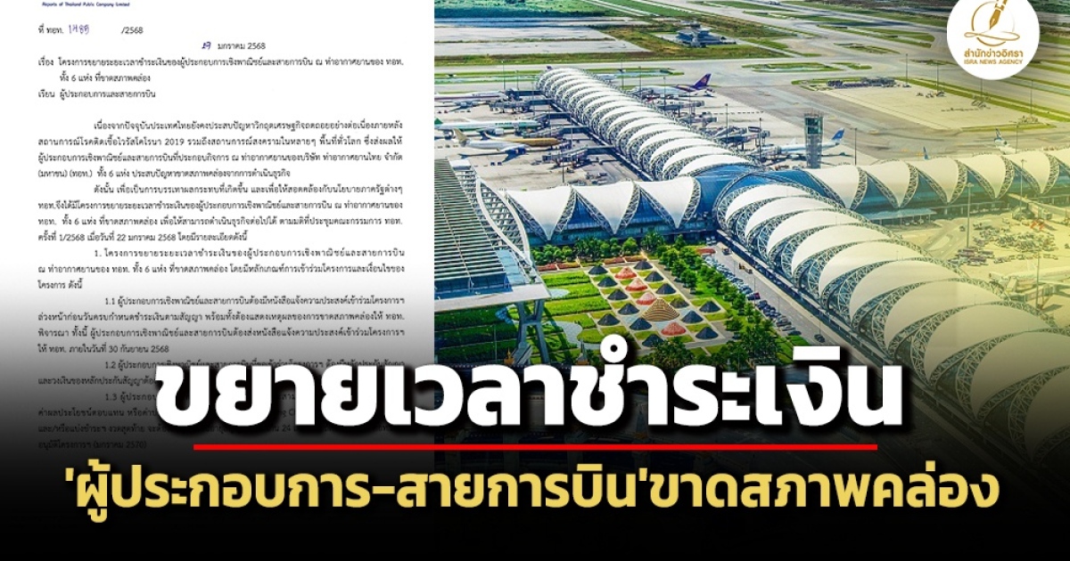สำนักข่าวอิศรา (www.isranews.org) รายงานว่า เมื่อวันที่ 27 ม.ค.2568 นายกีรติกิจ มานะวัฒน์ กรรมการผู้อำนวยการใหญ่ บมจ.ท่าอากาศยานไทย (ทอท.) หรือ AOT ได้ทำหนังสือที่ ทอท. 1484/2568 เรื่อง โครงการขยายระยะเวลาชำระเงินของผู้ประกอบการเชิงพาณิชย์และสายการบิน ณ ท่าอากาศยานของ ทอท. ทั้ง 6 แห่ง ที่ขาดสภาพคล่อง แจ้งไปยังผู้ประกอบการและสายการบิน โดยมีเนื้อหาว่า