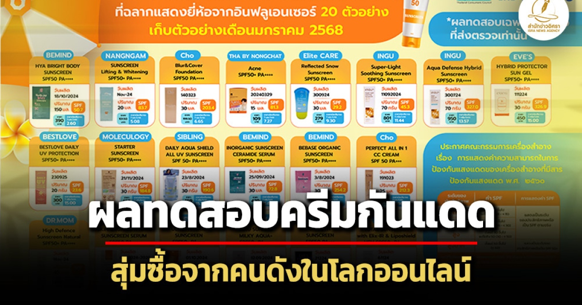 สำนักข่าวอิศรา (www.isranews.org) รายงานว่า เมื่อวันที่ 11 มี.ค. 2568 สภาองค์กรของผู้บริโภค ร่วมกับ นิตยสารฉลาดซื้อ มูลนิธิเพื่อผู้บริโภค จัดงานแถลงข่าว “ผลทดสอบค่า SPF ครีมกันแดด” ซึ่งรวบรวมรายชื่อผลิตภัณฑ์เครื่องสำอางกลุ่มผลิตภัณฑ์บำรุงผิวจากผู้มีชื่อเสียงหรือผู้มีอิทธิพลในโลกออนไลน์ที่เป็นเจ้าของผลิตภัณฑ์ที่มีการโฆษณาต่อผู้บริโภค โดยการทดสอบครั้งนี้ได้ส่งตัวอย่างวิเคราะห์ที่ห้องปฏิบัติการที่ได้รับการรับรองมาตรฐานสากล และเทียบข้อมูลโดยอ้างอิงตามประกาศคณะกรรมการเครื่องสำอาง เรื่อง การแสดงค่าความสามารถในการป้องกันแสงแดดของเครื่องสำอางที่มีสารป้องกันแสงแดด พ.ศ.2560 ภายใต้ พ.ร.บ.เครื่องสำอาง พ.ศ.2558
