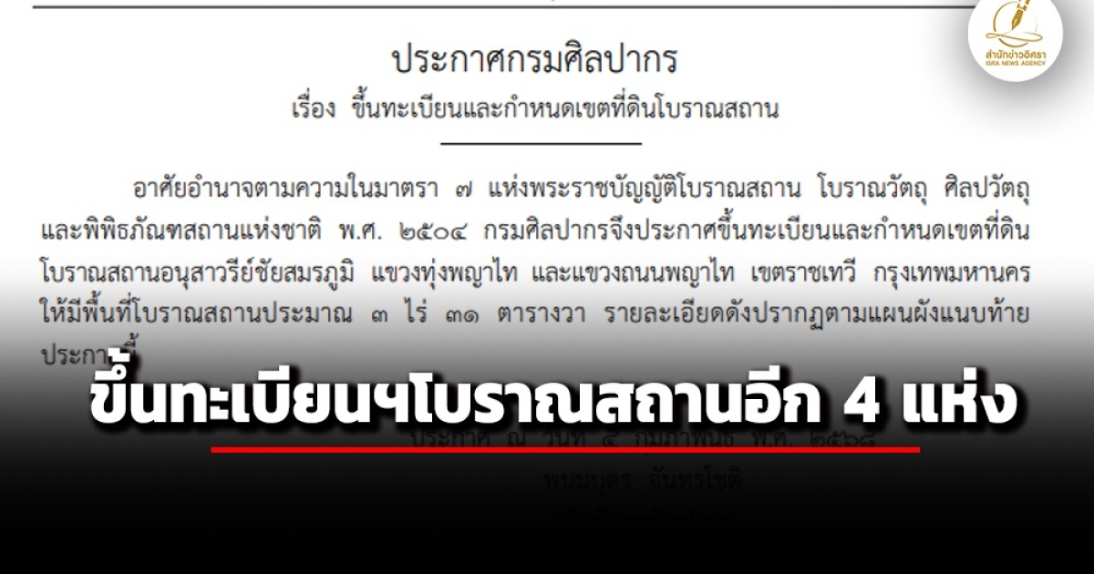 สำนักข่าวอิศรา www.isranews.org : ราชกิจจานุเบกษา วันที่ 12 มี.ค.2568 เผยแพร่ ประกาศกรมศิลปากร เรื่อง ขึ้นทะเบียนและกำหนดเขตที่ดินโบราณสถาน จำนวน 4 แห่ง ได้แก่ อนุสาวรีย์ชัยสมรภูมิ แขวงทุ่งพญาไท เขตราชเทวี กรุงเทพฯ , วัดฉัตรแก้วจงกลณี แขวงบางอ้อ เขตบางพลัด กรุงเทพฯ , โบราณสถานอุทกทาน หรือ พระแม่ธรณีบีบมวยผม แขวงพระบรมมหาราชวัง เขตพระนคร และ วัดบางขุนเทียนนอก เขตจอมทอง กรุงเทพฯ ดังนี้