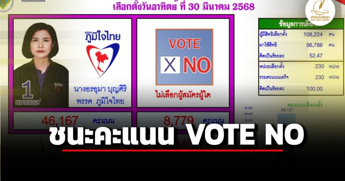 สำนักงานคณะกรรมการ กกต. ประจำจังหวัดบึงกาฬ ประกาศผลการนับคะแนนเลือกตั้งซ่อม สส.บึงกาฬ เขตเลือกตั้งที่ 2 อย่างไม่เป็นทางการ อรอุมา บุญศิริ ผู้สมัครหมายเลข 1 จากพรรคภูมิใจไทย ได้คะแนน 46,167 คะแนน สูงกว่า Vote No - กกต.เตรียมประกาศรับรองผลการเลือกตั้งอย่างเป็นทางการภายใน 60 วัน หากไม่มีเหตุอันควรสงสัยว่าการเลือกตั้งมิได้เป็นไปไปโดยจริตหรือเที่ยงธรรม และไม่มีคำร้องคัดค้าน