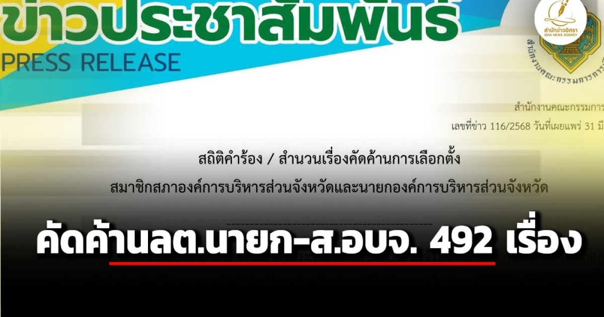 สำนักงานคณะกรรมการการเลือกตั้ง สรุปคำร้อง-สำนวน คัดค้านการเลือกตั้งนายก-สมาชิกอบจ. 492 เรื่อง วินิจฉัยชี้ขาดแล้ว 91 เรื่อง-ยื่นศาล 1 เรื่อง แจงขั้นตอนสืบสวน-ไต่สวน 4 ชั้น
