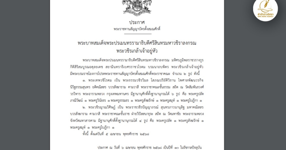 สำนักข่าวอิศรา (www.isranews.org) : ราชกิจจานุเบกษา วันที่ 6 เม.ย. 2568 เผยแพร่พระบรมราชโองการ ประกาศพระราชทานสัญญาบัตรตั้งสมณศักดิ์ ระบุว่า