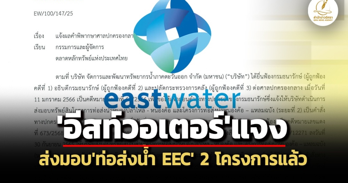 ‘อีสท์วอเตอร์’ แจ้งตลาดฯ แจงส่งมอบ ‘ท่อส่งน้ำ EEC’ 2 โครงการ ให้ ‘กรมธนารักษ์’ ครบถ้วนแล้ว ยันผลคดีไม่กระทบต่อการดำเนินงานของบริษัทฯ
