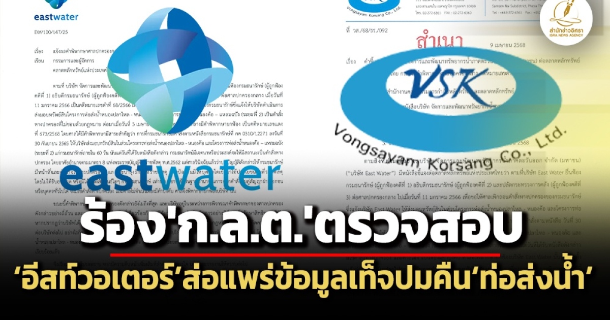 สำนักข่าวอิศรา (www.isranews.org) รายงานว่า เมื่อวันที่ 9 เม.ย.ที่ผ่านมา บริษัท วงษ์สยามก่อสร้าง จำกัด ในฐานะคู่สัญญาของกรมธนารักษ์ และเป็นผู้มีหน้าที่บริหารโครงการระบบท่อส่งน้ำสายหลักในภาคตะวันออกฯ ทำหนังสือถึงเลขาธิการสำนักงานคณะกรรมการกำกับหลักทรัพย์และตลาดหลักทรัพย์ (ก.ล.ต.) ในฐานะผู้มีหน้าที่กำกับดูแลบริษัทจดทะเบียนในตลาดหลักทรัพย์ ขอให้ดำเนินการตรวจสอบข้อเท็จจริงกรณีบริษัท East Water บอกกล่าว เผยแพร่ หรือให้ข้อความอันเป็นเท็จ หรืออาจก่อให้เกิดความสำคัญผิดในสาระสำคัญ มีเจตนาให้ข้อมูลที่ไม่ถูกต้องดังกล่าว