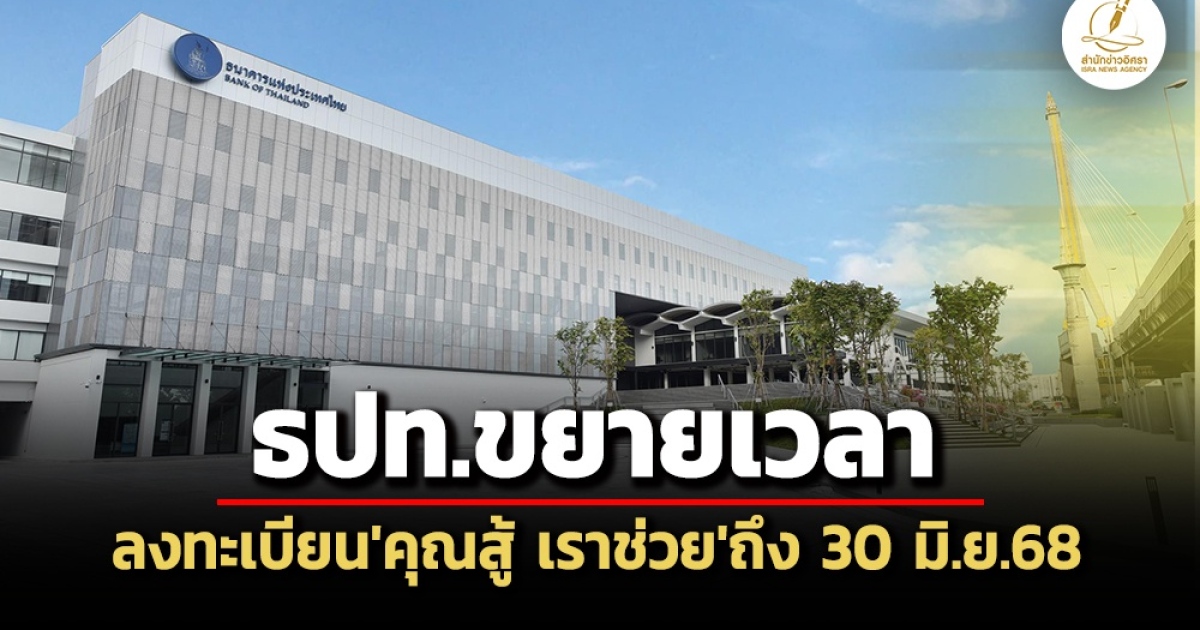 ‘แบงก์ชาติ’ขยายระยะเวลาโครงการ ‘คุณสู้ เราช่วย’ ถึง 30 มิ.ย.68 จากเดิมที่สิ้นสุด 30 เม.ย.นี้ หลัง ‘ลูกหนี้’ ยังมีความสนใจต่อเนื่อง ขณะที่ยอดลงทะเบียนล่าสุด 1.3 ล้านราย ผู้เข้าข่ายเข้าร่วมโครงการฯ 5.3 แสนราย