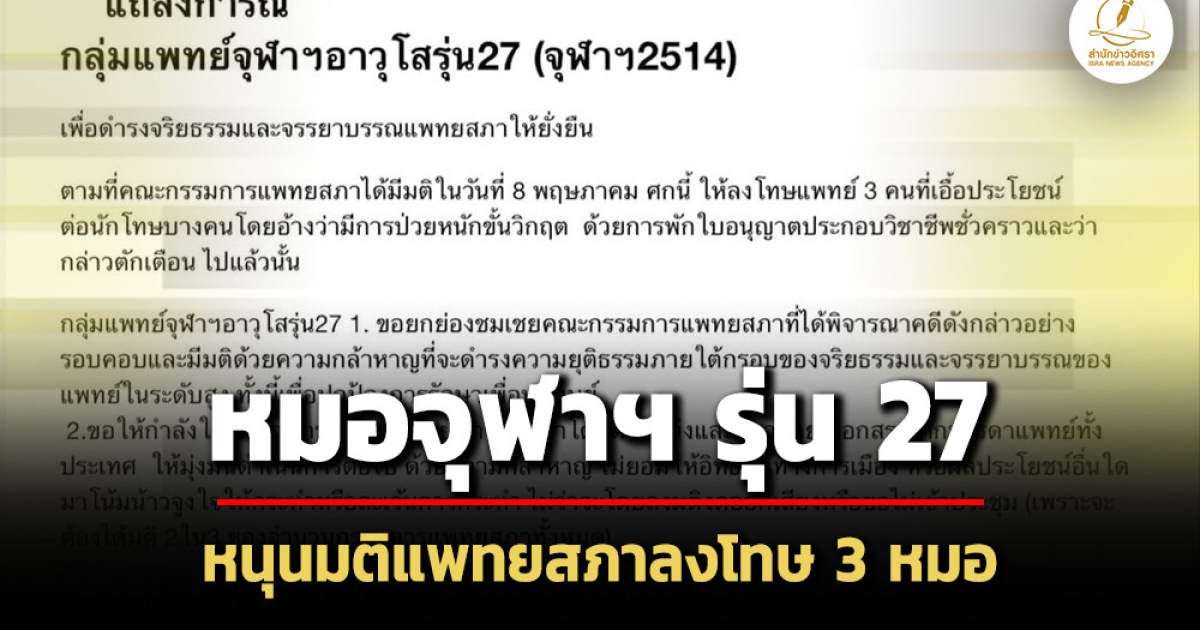 สำนักข่าวอิศรา (www.isranews.org) รายงานว่า เมื่อวันที่ 24 พฤษภาคม 2568 กลุ่มแพทย์จุฬาฯอาวุโสรุ่น27 (จุฬาฯ 2514)แถลงการณ์ถึงกรณีมติแพทยสภา ลงโทษแพทย์ 3 ราย ระบว่า