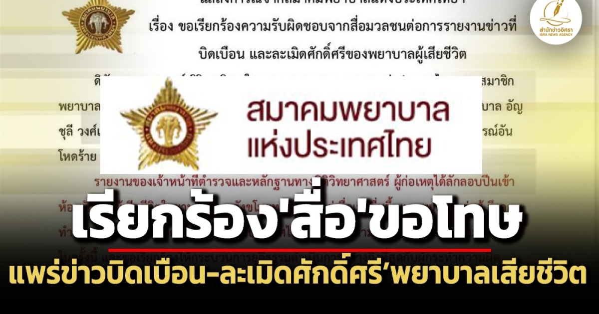 ‘สมาคมพยาบาลแห่งประเทศไทย’ เรียกร้อง ‘สำนักข่าว’ รับผิดชอบรายงานข่าว ‘บิดเบือน-ละเมิดศักดิ์ศรี’ ปมพยาบาลเสียชีวิต จี้ออกแถลงการณ์ ‘ขอโทษ’ อย่างเป็นทางการ-แก้ไขข่าวที่บิดเบือนทันที