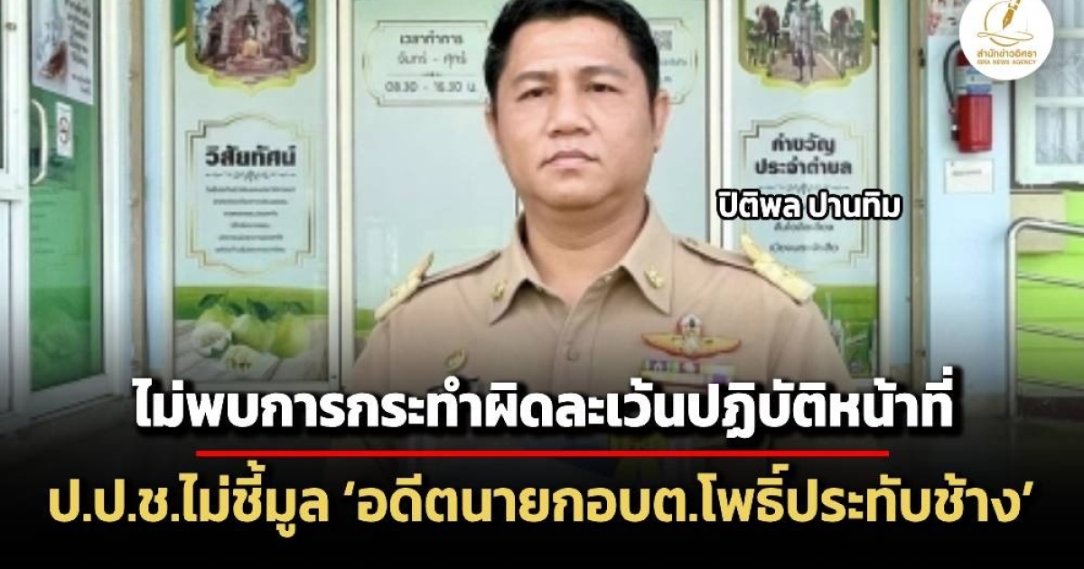 ป.ป.ช.จังหวัดพิจิตรไม่ชี้มูลความผิด ‘ปิติพล ปานทิม’ อดีตนายกอบต.โพธิ์ประทับช้าง จ.พิจิตร หลังแต่งตั้งรองนายกอบต.ที่ขาดคุณสมบัติด้านการศึกษา ชี้เป็นการกระทำโดยประมาท แต่ไม่มีเจตนาละเว้นการปฏิบัติหน้าที่