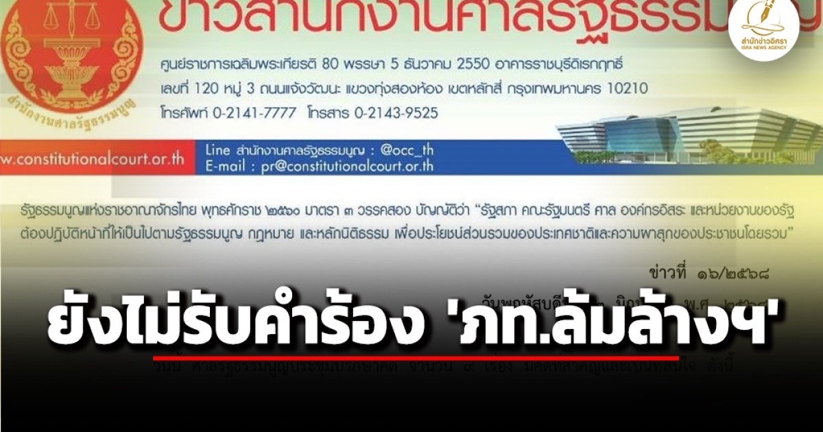 ศาลรัฐธรรมนูญ เผยแพร่เอกสารข่าวผลการประชุมปรึกษาคำร้องของ ณฐพร โตประยูร ปม กกต.- พรรคภูมิใจไทย - สว. ล้มล้างการปกครองฯ แจ้ง สำนักงานอัยการสูงสุด ส่งหนังสือการดำเนินการตามคำร้อง-รวบรวมพยานหลักฐาน กลับมาภายใน 15 วัน เพื่อประโยชน์ในการพิจารณาว่าจะรับคำร้องหรือไม่