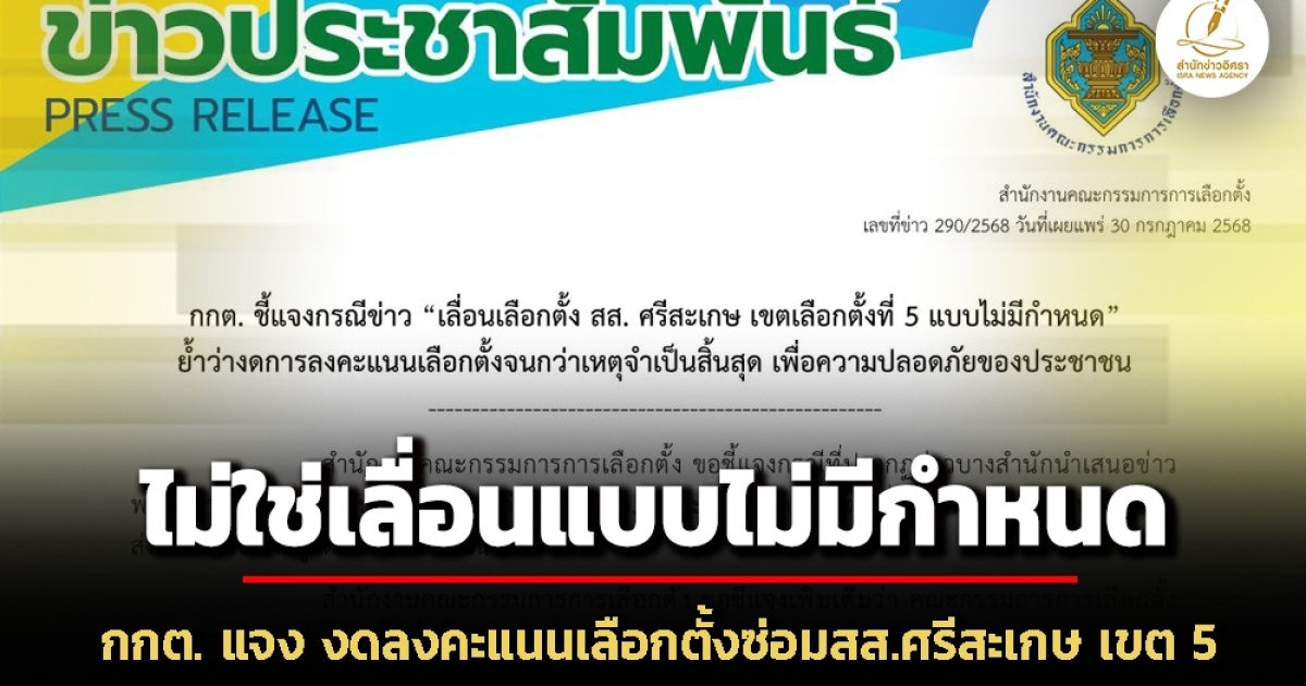 สำนักข่าวอิศรา (www.isranews.org) รายงานว่า วันที่ 30 กรกฎาคม 2568 สำนักงานคณะกรรมการการเลือกตั้ง (กกต.) เผยแพร่ข่าวประชาสัมพันธ์ (PRESS RELEASE) เลขที่ข่าว 290/2568 ชี้แจงกรณีข่าว เลื่อนเลือกตั้ง สส. ศรีสะเกษ เขตเลือกตั้งที่ 5 ในวันที่ 10 ส.ค.68 แบบไม่มีกำหนด ว่า เป็นงดการลงคะแนนเลือกตั้งจนกว่าเหตุจำเป็นสิ้นสุด เพื่อความปลอดภัยของประชาชน จากเหตุการณ์การปะทะกันตามแนวชายแดนไทยกับกัมพูชา โดยมีรายละเอียดดังต่อไปนี้