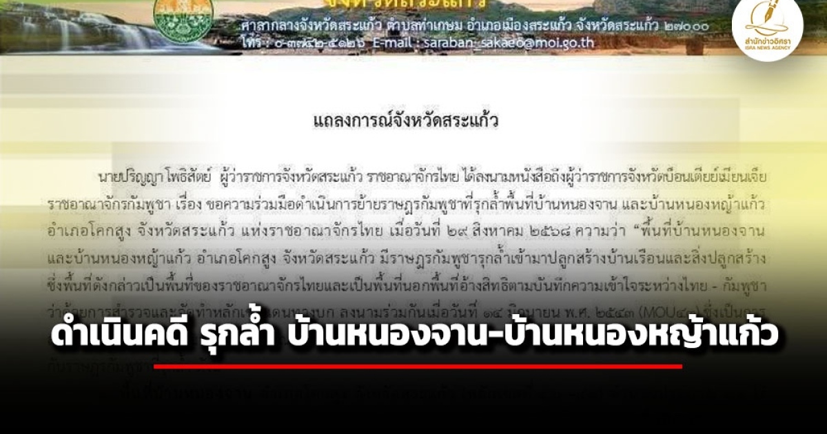 สำนักข่าวอิศรา (www.irsanews.org) รายงานว่า วันที่ 3 กันยายน 2568 จังหวัดสระแก้ว ออกแถลงการณ์จังหวัดสระแก้ว ดำเนินการตามกฎหมายที่เกี่ยวข้องกับราษฎรกัมพูชาที่รุกล้ำ จำนวน 2 พื้นที่ ประกอบด้วย 1.พื้นที่บ้านหนองจาน อำเภอโคกสูง และ 2.พื้นที่บ้านหนองหญ้าแก้ว อำเภอโคกสูง จังหวัดสระแก้ว เนื่องจากนายปริญญา โพธิสัตย์ ผู้ว่าราชการจังหวัดสระแก้ว ลงนามหนังสือถึงผู้ว่าราชการจังหวัดบ็อนเตียย์เมียนเจ็ย ราชอาณาจักรกัมพูชา ขอความร่วมมือการย้ายราษฎรกัมพูชาที่รุกล้ำพื้นที่บ้านหนองจาน และบ้านหนองหญ้าแก้ว อำเภอโคกสูง จังหวัดสระแก้ว เมื่อวันที่ 29 ส.ค.68 โดยระบุว่า พื้นที่บ้านหนองจานและบ้านหนองหญ้าแก้ว อำเภอโคกสูง จังหวัดสระแก้ว มีราษฎรกัมพูชารุกล้ำเข้ามาปลูกสร้างบ้านเรือนและสิ่งปลูกสร้าง ซึ่งพื้นที่ดังกล่าวเป็นพื้นที่ของราชอาณาจักรไทยและเป็นพื้นที่นอกพื้นที่อ้างสิทธิตามบันทึกความเข้าใจระหว่างไทย – กัมพูชา ว่าด้วยการสำรวจและจัดทำหลักเขตแดนทางบก ลงนามร่วมกันเมื่อวันที่ 14 มิถุนายน พ.ศ. 2543 (MOU43) ซึ่งเป็นการละเมิดอธิปไตยและกฎหมายแห่งราชอาณาจักรไทย จึงต้องดำเนินการตามกฎหมายที่เกี่ยวข้องกับราษฎรกัมพูชาที่รุกล้ำ โดยมีรายละเอียดดังนี้