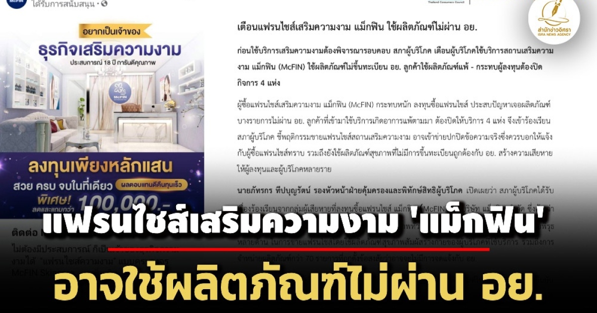 สำนักข่าวอิศรา (www.isranews.org) เมื่อวันที่ 8 ก.ย. 2568 นายภัทรกร ทีปบุญรัตน์ รองหัวหน้าฝ่ายคุ้มครองและพิทักษ์สิทธิผู้บริโภค เปิดเผยว่า สภาผู้บริโภคได้รับเรื่องร้องเรียนจากกลุ่มผู้เสียหายที่ลงทุนซื้อแฟรนไชส์ แม็กฟิน (McFIN) ของบริษัท แม็กฟิน จำกัด ซึ่งอ้างว่าดำเนินธุรกิจขายแฟรนไชส์ความงามและผลิตภัณฑ์สุขภาพทั่วประเทศ แต่ประสบปัญหาและเจอพบข้อพิรุธหลายด้าน ในการขายแฟรนไชส์โดยใช้ผลิตภัณฑ์สุขภาพสัมผัสร่างกายของผู้บริโภคที่ใช้บริการ รวมถึงการจำหน่ายผลิตภัณฑ์กว่า 70 รายการที่ถูกตั้งข้อสงสัยว่าอาจจะไม่มีการจดแจ้งกับ อย.