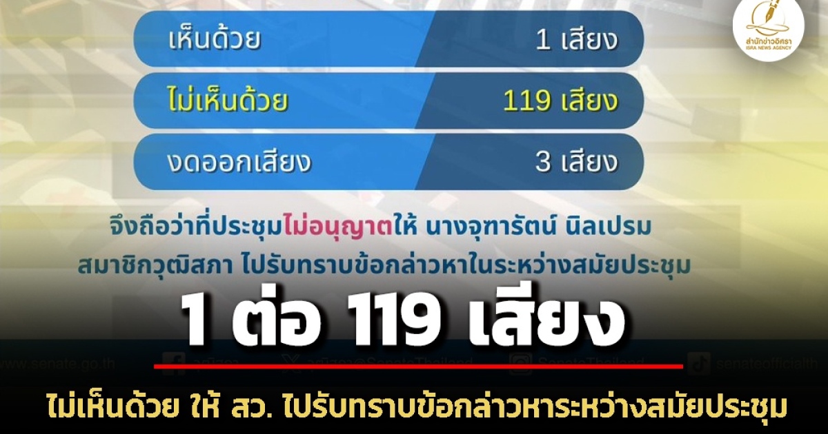 สำนักข่าวอิศรา (www.isranews.org) รายงานว่า วันที่ 9 กันยายน 2568 ที่รัฐสภา มีการประชุมของวุฒิสภา ซึ่งที่ประชุมวุฒิสภาเห็นชอบให้เลื่อนระเบียบวาระเรื่องด่วนที่ 2 ขออนุญาตให้สมาชิกวุฒิสภา (สว.) ไปรับทราบข้อกล่าวหา ซึ่งบรรจุในระเบียบวาระการประชุมวุฒิสภาขึ้นมาพิจารณาก่อนตามที่นางจุฑารัตน์ นิลเปรม สว. เสนอ และได้ลงมติด้วยคะแนนเสียงเห็นด้วย 1 เสียง ไม่เห็นด้วย 119 เสียง งดออกเสียง 3 เสียง จึงถือว่าที่ประชุมไม่อนุญาตให้ นางจุฑารัตน์ ไปรับทราบข้อกล่าวหาในระหว่างสมัยประชุม