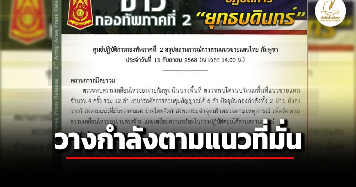 สำนักข่าวอิศรา (www.isranews.org) รายงานว่า วันที่ 13 กันยายน 2568 กองทัพภาคที่ 2 โพสต์ข้อความรายงานสรุปสถานการณ์บริเวณชายแดนไทย-กัมพูชา ณ เวลา 14.00 น. โดย ศูนย์ปฏิบัติการกองทัพภาคที่ 2 ว่า สถานการณ์โดยรวม ตรวจพบความเคลื่อนไหวของฝ่ายกัมพูชาในบางพื้นที่ ตรวจพบโดรนบริเวณพื้นที่แนวชายแดน จำนวน 4 ครั้ง รวม 12 ลำ สามารถตัดการควบคุมสัญญาณได้ 6 ลำ ปัจจุบันกองกำลังทั้ง 2 ฝ่าย ยังคงวางกำลังตามแนวที่มั่นของตนเอง ฝ่ายไทยจัดกำลังพลประจำจุดเฝ้าตรวจตามเหตุการณ์ เพื่อติดตามความเคลื่อนไหวของฝ่ายตรงข้าม และเตรียมความพร้อมในการปฏิบัติตอบโต้ตามสถานการณ์