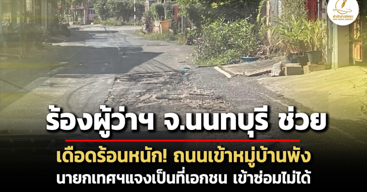 ชาวบ้าน ต.บางรักพัฒนา บางบัวทอง จ.นนทบุรี เดือดร้อนหนัก ถนนทางเข้าหมู่บ้านไผ่เหลือง ไผ่องทอง พังนาน 3 เดือน เทศบาลฯปล่อยทิ้ง ไร้แก้ไข ด้าน นายกฯเผยเป็นที่เอกชน มีปัญหามากว่า 3 ปี กำลังติดต่อหาเจ้าของที่ คาดโอนเป็นที่สาธารณะเสร็จจะซ่อมได้ในงบปี 69 พร้อมแก้ไขปัญหาน้ำท่วมขังไปพร้อมกัน