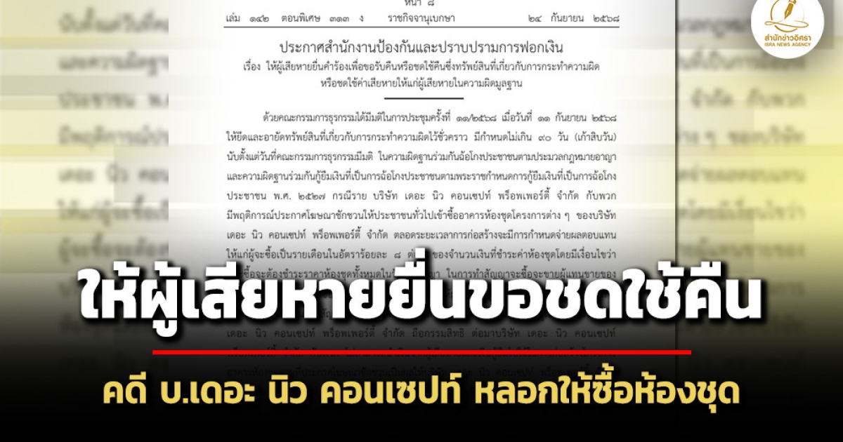 สำนักข่าวอิศรา (www.isranews.org) รายงานว่า เมื่อวันที่ 28 ก.ย. 2568 ราชกิจจานุเบกษาวันที่ 24 กันยายน 2568 เผยแพร่ประกาศสำนักงานป้องกันและปราบปรามการฟอกเงิน เรื่อง ให้ผู้เสียหายยื่นคำร้องเพื่อขอรับคืนหรือชดใช้คืนซึ่งทรัพย์สินที่เกี่ยวกับการกระทำความผิดหรือชดใช้ค่าเสียหายให้แก่ผู้เสียหายในความผิดมูลฐาน คดี บริษัท เดอะ นิว คอนเซปท์ พร็อพเพอร์ตี้ จำกัด ฉ้อโกงประชาชน หลอกชักชวนให้ซื้อห้องชุดพร้อมเสนอผลตอบแทนรายเดือน แต่ไม่สามารถก่อสร้างโครงการเสร็จตามสัญญา