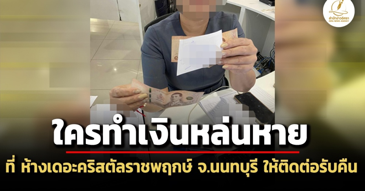 มีผู้แจ้งมายังสำนักข่าวอิศรา www.isranews.org ให้ช่วยแจ้งประชาสัมพันธ์ กรณีเมื่อช่วงเย็นเวลาประมาณ 17.00 น.วันศุกร์ที่ 26 กันยายน 2568 มีผู้เก็บเงินสดได้จำนวนหลักพันบาท ที่พื้นบริเวณทางเดิน ข้างร้านกาแฟชื่อดังภายในห้าง เดอะคริสตัล เอสบี ราชพฤกษ์ (The Crystal SB Ratchapruek) อ.บางรวย จ.นนทบุรี ผู้เก็บเงินจำนวนดังกล่าวได้นำไปฝากไว้ที่เจ้าหน้าที่ประจำเคาน์เตอร์ประชาสัมพันธ์ของห้าง บริเวณชั้น 1 เพื่อติดตามหาเจ้าของ หากผู้ใดทำหล่น ให้นำหลักฐานระบุตัวตน ติดต่อรับคืนได้ที่เจ้าหน้าที่ เคาน์เตอร์ ประชาสัมพันธ์ของห้างฯ ด้วย