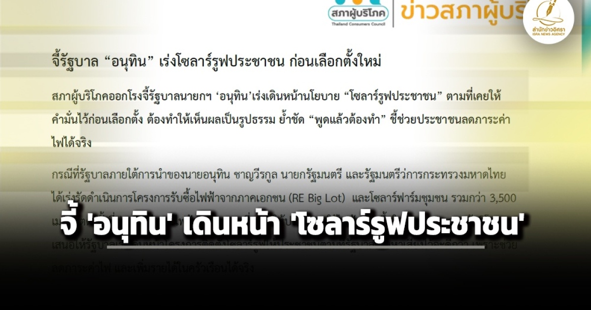 ‘สภาผู้บริโภค’ จี้ ‘อนุทิน’ เร่งเดินหน้านโยบาย ‘โซลาร์รูฟประชาชน’ ตามที่เคยให้คำมั่นไว้ก่อนเลือกตั้ง ต้องทำให้เห็นผลเป็นรูปธรรม ย้ำ ‘พูดแล้วต้องทำ’ ชี้ ช่วยประชาชนลดภาระค่าไฟฟ้าได้จริง ชง กระทรวงพลังงาน-ครม. 4 ข้อเสนอเร่งด่วน