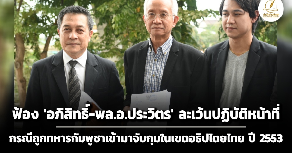 สำนักข่าวอิศรา (www.isranews.org) รายงานว่า เมื่อวันที่ 23 ธ.ค. 2568 ที่ศาลอาญาคดีทุจริตและประพฤติมิชอบกลาง นายวีระ สมความคิด นักเคลื่อนไหวทางการเมือง เป็นโจทก์ ยื่นฟ้อง นายอภิสิทธิ์ เวชชาชีวะ อดีตนายกรัฐมนตรี พล.อ.ประวิตร วงษ์สุวรรณ อดีตรัฐมนตรีว่าการกระทรวงกลาโหม นายกษิต ภิรมย์ อดีตรัฐมนตรีว่าการกระทรวงการต่างประเทศ นายประศาสน์ ประศาสน์วินิจฉัย อดีตเอกอัครราชทูตไทยประจำกรุงพนมเปญ เป็นจำเลยในความผิดฐาน ละเว้นการปฏิบัติหน้าที่เป็นเหตุทำให้นายวีระและ น.ส.ราตรี พิพัฒนาไพบูรณ์ ต้องถูกทหารกัมพูชาใช้อาวุธสงคราม เข้ามาจับตัวในเขตอธิปไตยของไทย บริเวณบ้านหนองจาน ต.โนนหมากมุ่น อ.โคกสูง จ.สระแก้ว และถูกจองจำในเรือนจำเปรัยซอว์ กรุงพนมเปญ ประเทศกัมพูชา เป็นเวลาหลายปี