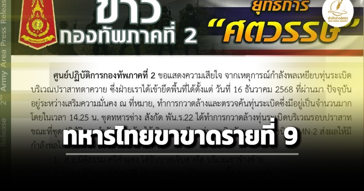 สำนักข่าวอิศรา (www.isranews.org) รายงานว่า วันที่ 25 ธันวาคม 2568 เพจกองทัพภาคที่ 2 โพสต์ เอกสารข่าวกองทัพภาคที่ 2 ระบุว่า ศูนย์ปฏิบัติการกองทัพภาคที่ 2 ขอแสดงความเสียใจ จากเหตุการณ์กำลังพลเหยียบทุ่นระเบิด บริเวณปราสาทตาควาย ซึ่งฝ่ายเราได้เข้ายึดพื้นที่ได้ตั้งแต่ วันที่ 16 ธันวาคม 2568 ที่ผ่านมานั้น ปัจจุบันอยู่ระหว่างเสริมความมั่นคง ณ ที่หมาย, ทำการกวาดล้างและตรวจค้นทุ่นระเบิดซึ่งมีอยู่เป็นจำนวนมาก