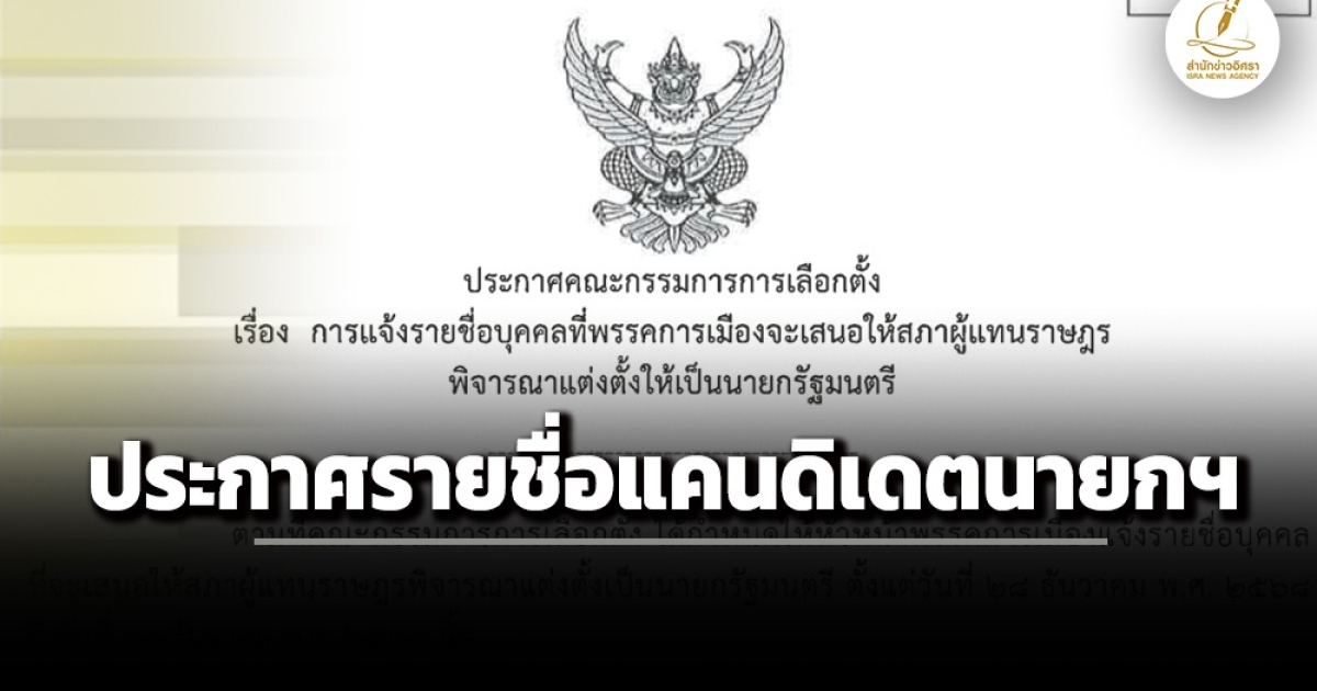 สำนักข่าวอิศรา (www.isranews.org) รายงานว่า นายณรงค์ กลั่นวารินทร์ ประธานกรรมการการเลือกตั้ง (กกต.) ลงนามในประกาศกตต. เมื่อวันที่ 6 ม.ค.69 เรื่อง การประกาศรายชื่อบุคคลที่พรรคการเมืองจะเสนอให้สภาผู้แทนราษฎรพิจารณาแต่งตั้งให้เป็นนายกรัฐมนตรี จำนวน 43 พรรค 93 ราย โดยเรียงตามลำดับอักษรได้ดังนี้