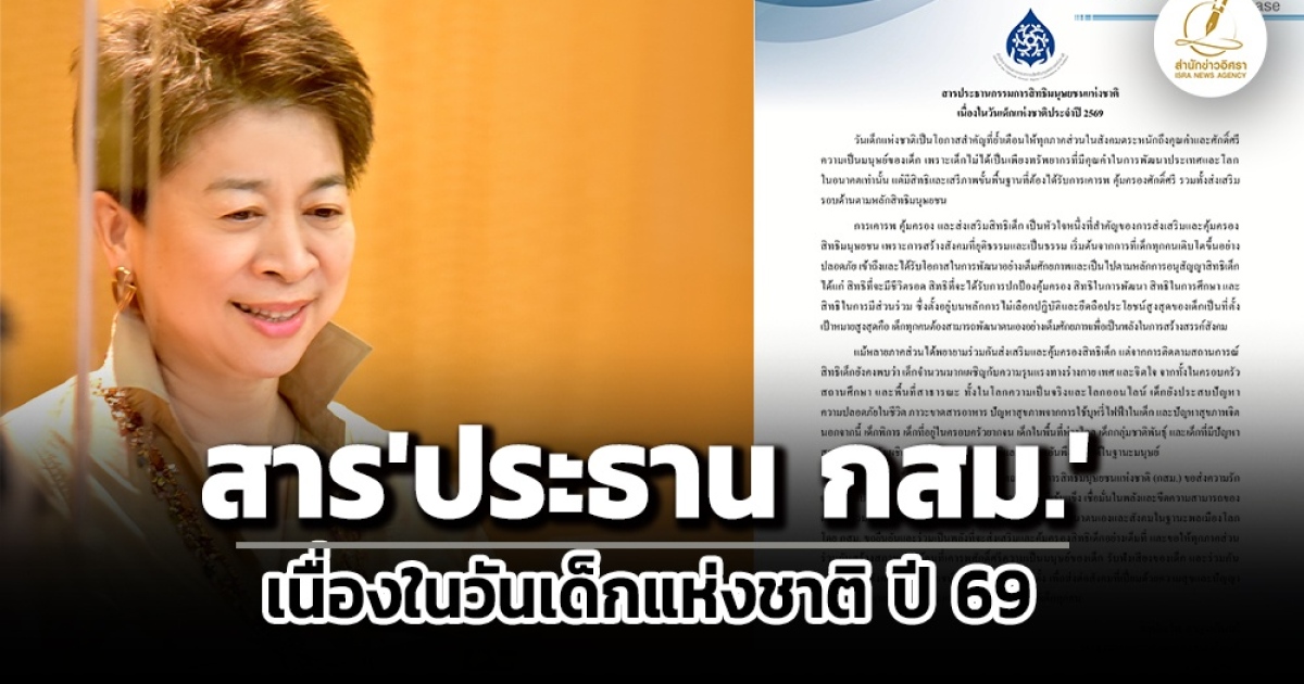 เนื่องในวันเด็กแห่งชาติประจำปี 2569 คณะกรรมการสิทธิมนุษยชนแห่งชาติ (กสม.) ขอส่งความรักและความปรารถนาดีไปยังเด็กทุกคน ให้มีพลังกายและใจที่เข้มแข็ง เชื่อมั่นในพลังและขีดความสามารถของตนเอง รวมทั้งกล้าที่จะตั้งคำถามและแลกเปลี่ยนเรียนรู้เพื่อพัฒนาตนเองและสังคมในฐานะพลเมืองโลก โดย กสม. ขอยืนยันและร่วมเป็นพลังที่จะส่งเสริมและคุ้มครองสิทธิเด็กอย่างเต็มที่ และขอให้ทุกภาคส่วนร่วมกันสร้างสภาพแวดล้อมที่เคารพศักดิ์ศรีความเป็นมนุษย์ของเด็ก รับฟังเสียงของเด็ก และร่วมกันวางรากฐานสังคมที่ถือประโยชน์สูงสุดของเด็กเป็นที่ตั้ง เพื่อส่งต่อสังคมที่เปี่ยมด้วยความสุขและปัญญา เคารพสิทธิมนุษยชน ปลอดภัย และไม่เลือกปฏิบัติ ให้แก่เด็กทุกคน