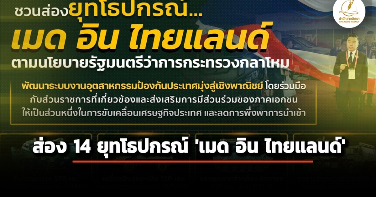 สำนักข่าวอิศรา (www.isranews.org) รายงานว่า เมื่อวันที่ 24 กุมภาพันธ์ 2569 เพจ สำนักโฆษกกระทรวงกลาโหม โพสต์เฟซบุ๊ก ชวนส่องยุทโธปกรณ์… ‘เมด อิน ไทยแลนด์’ พร้อมกับระบุข้อความและรูปภาพ ว่า นโยบายรัฐมนตรีว่าการกระทรวงกลาโหม : พลเอก ณัฐพล นาคพาณิชย์ | พัฒนาระบบงาน #อุตสาหกรรมป้องกันประเทศ มุ่งสู่เชิงพาณิชย์ โดยร่วมมือกับส่วนราชการที่เกี่ยวข้อง และส่งเสริมการมีส่วนร่วมของภาคเอกชน ให้เป็นส่วนหนึ่งในการขับเคลื่อนเศรษฐกิจประเทศ และลดการพึ่งพาการนำเข้า