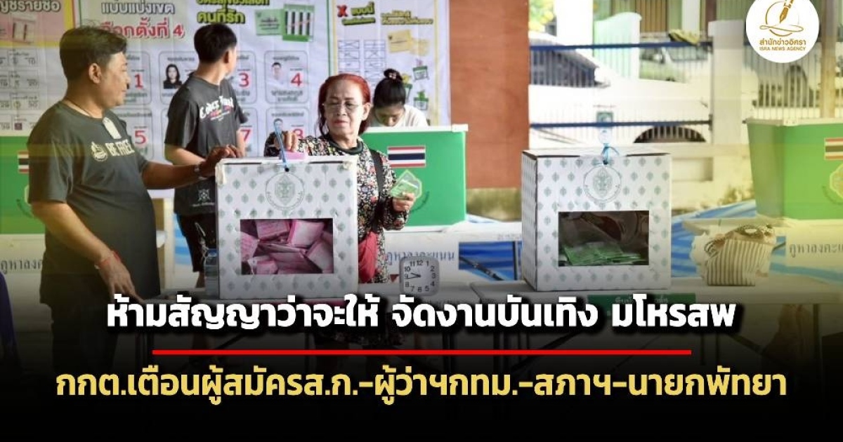 กกต.ออกโรงเตือนบรรดาผู้สมัครผู้สมัครส.ก.-ผู้ว่าฯกทม.-สภาฯ-นายกพัทยา ช่วงเทศกาลสงกรานต์ห้ามหาเสียงแบบสัญญาว่าจะให้ หรือจัดงานบันเทินรื่นเริง มโหรสพ การแสดง ชี้อาจผิดกฎหมายและระเบียบเกี่ยวกับการเลือกตั้ง