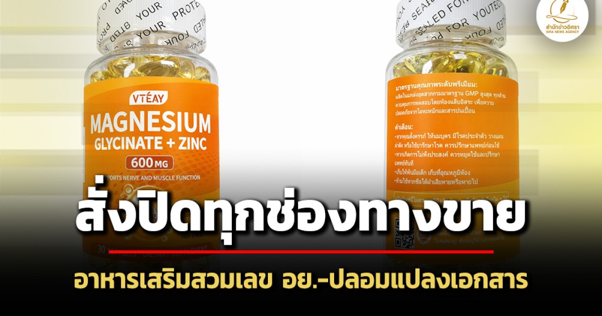สำนักข่าวอิศรา (www.isranews.org) รายงานว่า เมื่อวันที่ 18 เม.ย. 2569 ภญ.สุภัทรา บุญเสริม เลขาธิการคณะกรรมการอาหารและยา เปิดเผยว่า จากการตรวจสอบเฝ้าระวังการจำหน่ายผลิตภัณฑ์สุขภาพทางออนไลน์อย่างต่อเนื่อง พบพฤติการณ์ของกลุ่มมิจฉาชีพขายผลิตภัณฑ์เสริมอาหาร VTEAY MAGNESIUM GLYCINATE + ZINC ราคาถูก และแสดงเลข อย. ของผลิตภัณฑ์อื่น บนแพลตฟอร์มออนไลน์ มีผู้หลงเชื่อซื้อสินค้าดังกล่าวเป็นจำนวนมาก นอกจากนี้ ยังพบว่า ร้านค้าที่จำหน่ายผลิตภัณฑ์ดังกล่าวมีการปลอมเอกสารการได้รับอนุญาตผลิตภัณฑ์ และนำมาใช้เปิดร้านค้าทางการ (Official Store) บนแพลตฟอร์มออนไลน์ เพื่อสร้างความน่าเชื่อถือ ซึ่งขณะนี้ อย. ได้ประสานทุกแพลตฟอร์มให้ดำเนินการปิดร้านค้าดังกล่าวเรียบร้อยแล้ว