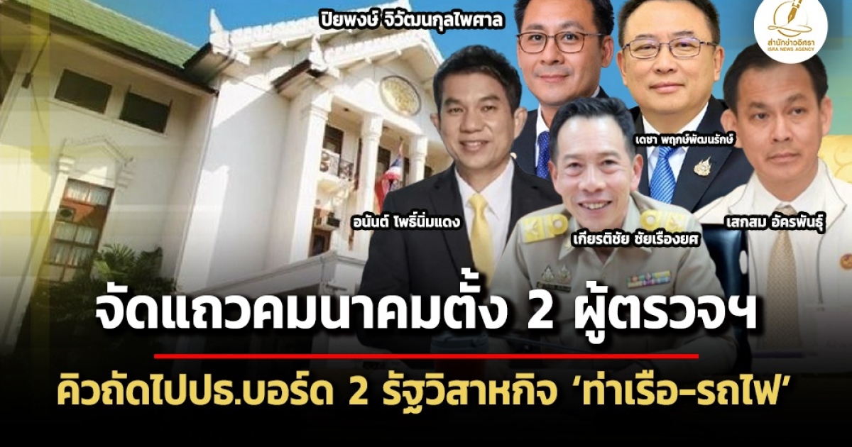 ‘พิพัฒน์’จัดแถวกระทรวงคมนาคม ประเดิมครม.มีมติตั้ง 2 ผู้ตรวจราชกากระทรวง โยก ‘เสกสม’ จากขนส่งและ ‘เกียรติชัย’ จากกรมท่าอากาศยานมาประจำ พร้อมเห็นชอบ ‘อนันตื โพธิ์นิ่มแดง’ เป็นผู้ว่ารฟท.ทางการ คิวถัดไปเตรียมเสนอตั้งประธานบอร์ด 2 รัฐวิสาหกิจ ‘อธิบดีทางหลวง’ นั่งประธานบอร์ดรถไฟ ส่วน ‘อดีตอธิบดีเดชา พฤกษ์พัฒนรักษ์’ เตรียมนั่งประธานบอรืดท่าเรือ