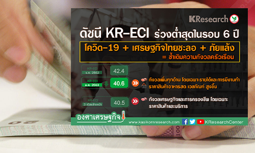 สำนักข่าวอิศรา (www.isranews.org) รายงานว่า ศูนย์วิจัยกสิกรไทย เผยแพร่ผลสำรวจดัชนีภาวะเศรษฐกิจและการครองชีพของครัวเรือนไทย (KR-ECI) ในเขตกรุงเทพฯ ปริมณฑล และต่างจังหวัด พบว่า ดัชนีฯปรับตัวลดลงจาก 42.4 ในเดือนธ.ค. 2562 มาอยู่ที่ 40.6 ในเดือนม.ค. 2563 นับเป็นระดับต่ำสุดในรอบ 72 เดือน หรือ 6 ปี จากความกังวลที่เพิ่มขึ้นในทุกด้าน โดยเฉพาะรายได้และการมีงานทำ
