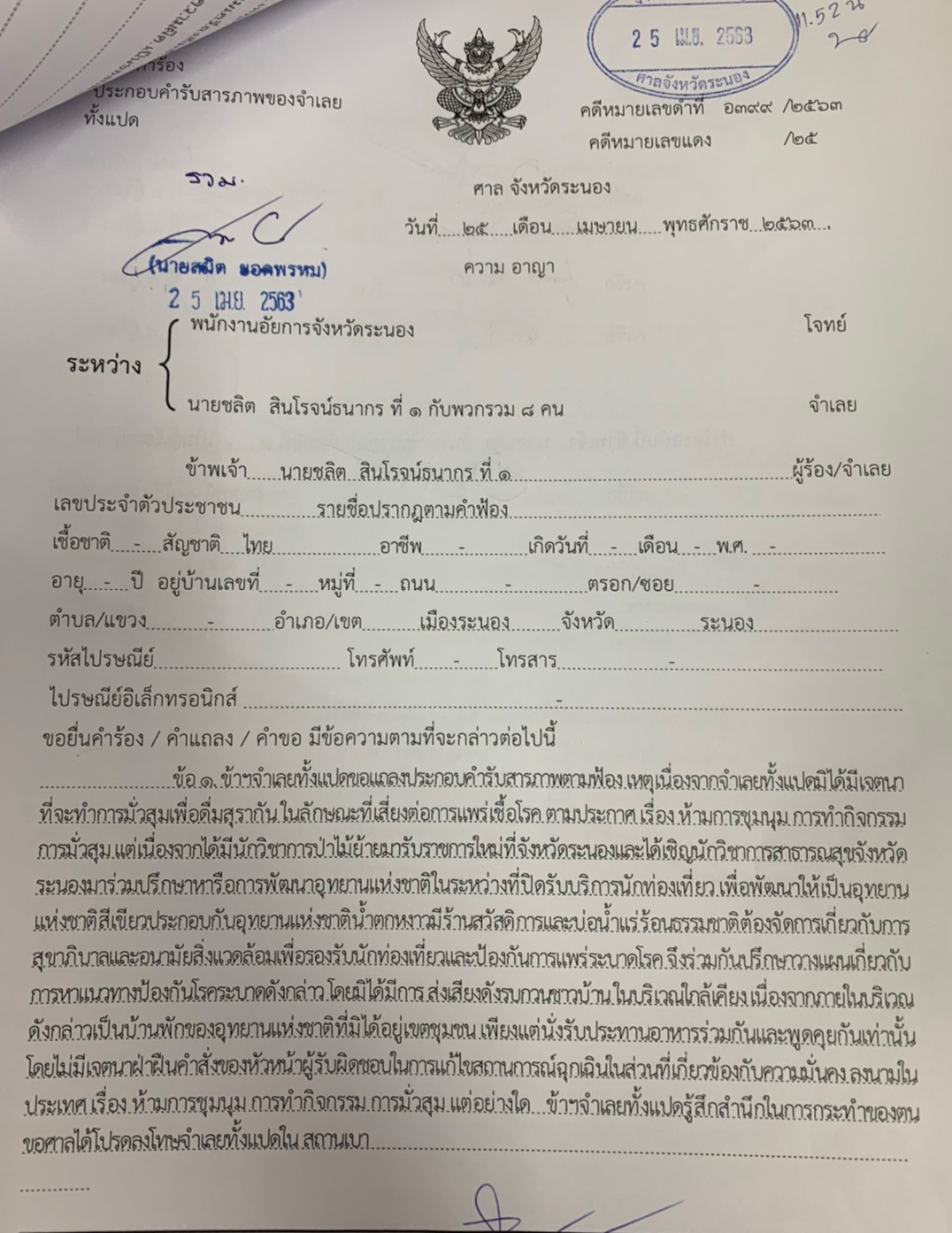 ข้อเท็จจริงกรณีนี้ จำเลยทั้ง 8 รายแถลงประกอบคำรับสารภาพ สรุปได้ว่า จำเลยทั้ง 8 ราย มิได้มีเจตนาที่จะทำการมั่วสุมเพื่อดื่มสุราในลักษณะที่เสี่ยงต่อการแพร่เชื้อโรค แต่เนื่องจากมีนักวิชาการป่าไม้ย้ายมารับราชการใหม่ที่ จ.ระนอง และได้เชิญนักวิชาการสาธารณสุข จ.ระนอง มาร่วมปรึกษาหารือการพัฒนาอุทยานแห่งชาติ ในระหว่างที่ปิดรับบริการนักท่องเที่ยว เพื่อพัฒนาให้เป็นอุทยานแห่งชาติสีเขียว ประกอบกับอุทยานแห่งชาติน้ำตกหงาว มีร้านสวัสดิการและบ่อน้ำแร่ร้อนธรรมชาติ ต้องจัดการเกี่ยวกับการสุขาภิบาล และอนามัยสิ่งแวดล้อม เพื่อรองรับนักท่องเที่ยว โดยมิได้มีการส่งเสียงรบกวนชาวบ้านในบริเวณใกล้เคียง เนื่องจากภายในบริเวณดังกล่าวเป็นบ้านพักของอุทยานแห่งชาติมิใช่ในเขตชุมชน เพียงแต่นั่งรับประทานอาหารร่วมกัน และพูดคุยกันเท่านั้น โดยไม่มีเจตนาฝ่าฝืนคำสั่งของหัวหน้าผู้รับผิดชอบในการแก้ไขสถานการณ์ฉุกเฉินที่เกี่ยวกับความมั่นคง ทั้งนี้จำเลยทั้ง 8 รายรู้สึกสำนึกในการกระทำของตน ขอศาลได้โปรดลงโทษจำเลยทั้งหมดในสถานเบา