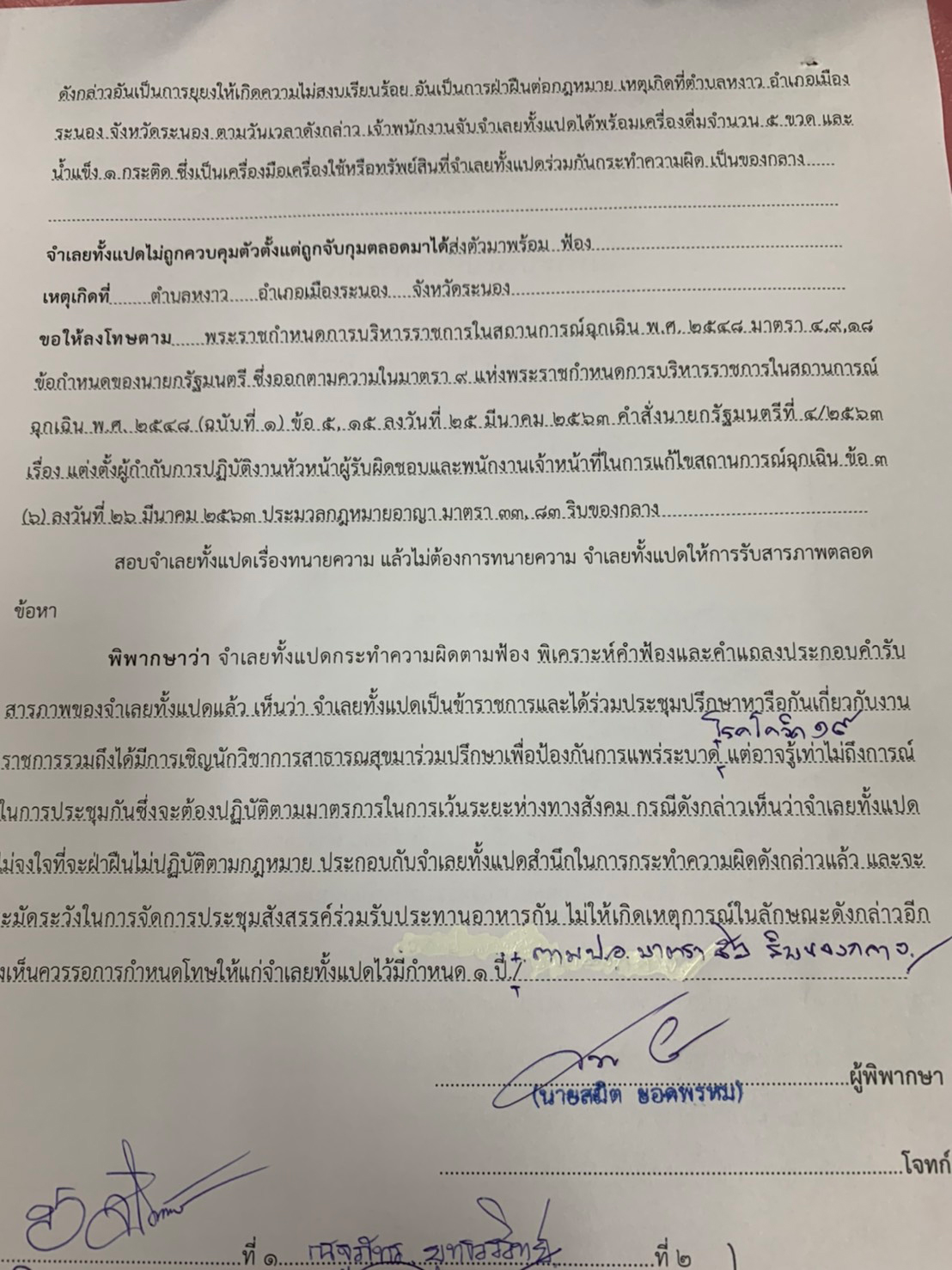 โดยศาลจังหวัดระนองเห็นว่า จำเลยที่เป็นข้าราชการทั้ง 8 รายกระทำความผิดตามฟ้อง แต่พิเคราะห์คำฟ้องและคำแถลงประกอบคำรับสารภาพของจำเลยเห็นว่า จำเลยทั้ง 8 ราย เป็นข้าราชการและได้ร่วมประชุมปรึกษาหารือกันเกี่ยวกับงานราชการ รวมถึงมีการเชิญนักวิชาการสาธารณสุขมาร่วมปรึกษาเพื่อป้องกันการแพร่ระบาดโรคโควิด-19 แต่อาจรู้เท่าไม่ถึงการณ์ ในการประชุมกันจะต้องปฏิบัติตามมาตรการเว้นระยะห่างทางสังคม กรณีดังกล่าวเห็นว่า จำเลยทั้ง 8 ราย ไม่จงใจที่จะฝ่าฝืนไม่ปฏิบัติตามกฎหมาย ประกอบกับจำเลยทั้ง 8 ราย สำนึกในการกระทำความผิดดังกล่าวแล้ว และจะระมัดระวังในการจัดการประชุมสังสรรค์ร่วมรับประทานอาหารกัน ไม่ให้เกิดเหตุการณ์ลักษณะดังกล่าวอีก จึงเห็นควรรอกำหนดโทษให้แก่จำเลยทั้ง 8 ราย ไว้มีกำหนด 1 ปี