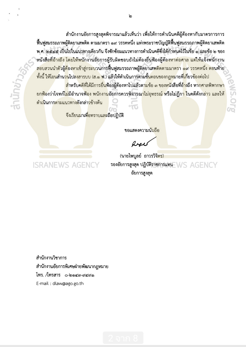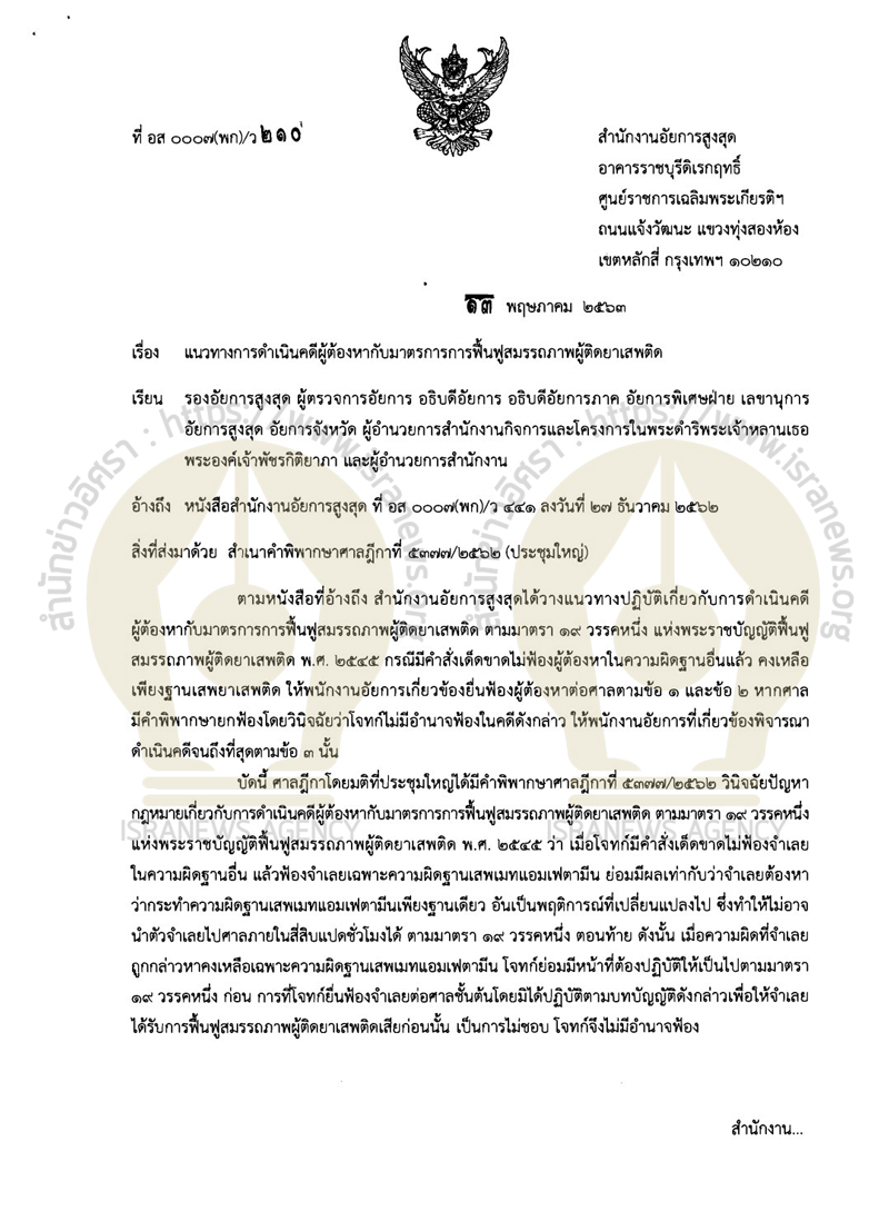 ผู้สื่อข่าวรายงานว่า เมื่อวันที่ 13 พ.ค. 2563 ที่ผ่านมา สำนักงานอัยการสูงสุด (อสส.) มีหนังสือลงนามโดยนายไพบูลย์ ถาวรวิจิตร รอง อสส. ปฏิบัติราชการแทน อสส. ถึงทุกหน่วยงานภายในสำนักงาน อสส. เรื่องแนวทางการดำเนินคดีผู้ต้องหากับมาตรการฟื้นฟูสมรรถภาพผู้ติดยาเสพติด โดยอ้างอิงสำเนาคำพิพากษาศาลฎีกาที่ 5377/2562 (ประชุมใหญ่)