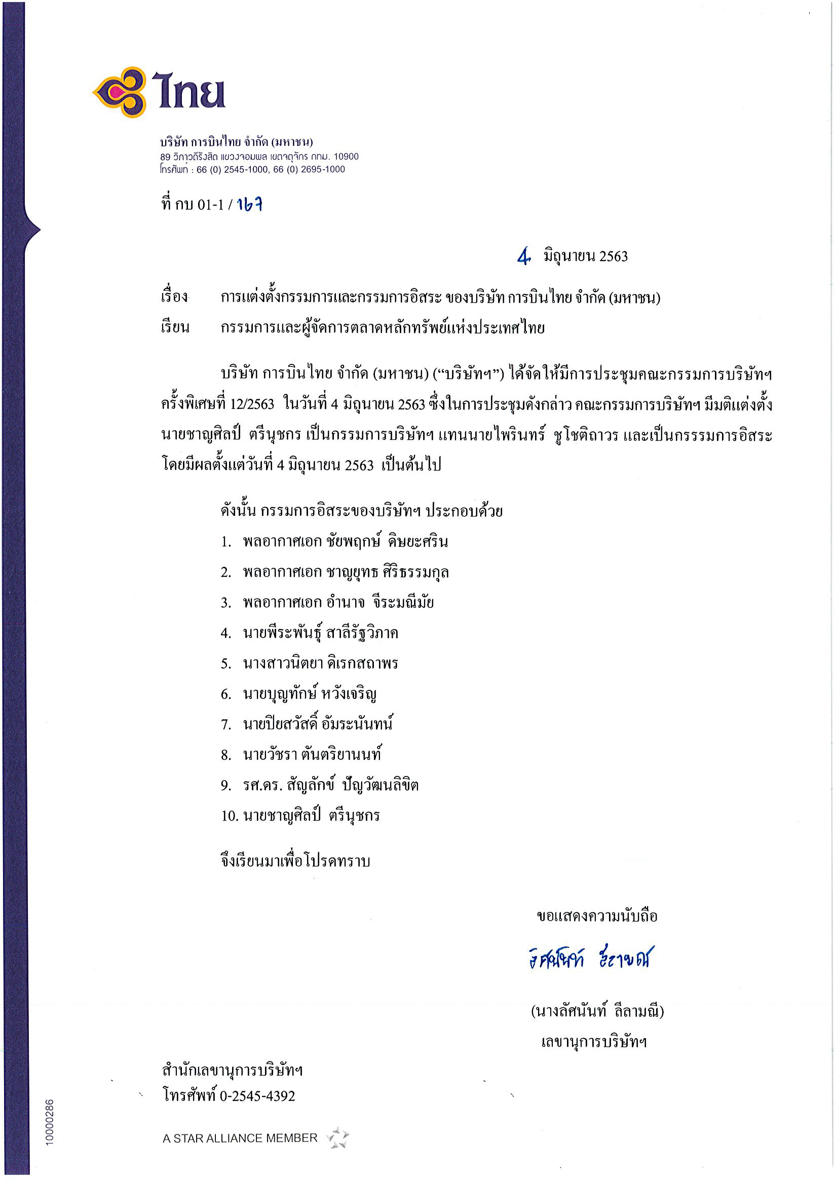 สำนักข่าวอิศรา (www.isranews.org) รายงานว่า เมื่อวันที่ 4 มิ.ย. บริษัท การบินไทย จำกัด (มหาชน) แจ้งตลาดหลักทรัพย์ฯ ว่า บริษัทฯ ได้จัดให้มีการประชุมคณะกรรมการบริษัทครั้งพิเศษที่ 12/2563 เมื่อ 4 มิ.ย.63 ซึ่งในการประชุมดังกล่าว ที่ประชุมมีมติแต่งตั้งนายชาญศิลป์ ตรีนุชกร เป็นกรรมการบริษัทฯ แทนนายไพรินทร์ ชูโชติถาวร และเป็นกรรมการอิสระ โดยมีผลตั้งแต่วันที่ 4 มิ.ย.63 เป็นต้นไป