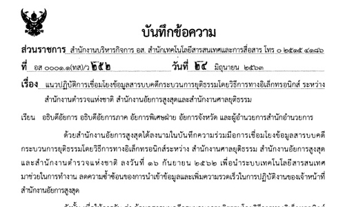 บันทึกข้อความดังกล่าว ระบุสาระสำคัญคือ เพื่อให้การรับ-ส่งข้อมูลสารบบคดีกระบวนการยุติธรรมโดยวิธีการทางอิเล็กทรอนิกส์ระหว่าง สตช. สำนักงาน อสส. และสำนักงานศาลยุติธรรมเป็นไปด้วยความถูกต้องและเป็นแนวทางเดียวกัน จึงกำหนดแนวปฏิบัติ เช่น การรับส่งข้อมูลระหว่างสำนักงาน อสส. และ สตช. โดยการรับสำนวนให้ดึงข้อมูลจากระบบ AGO-NSW ส่วนการส่งข้อมูลให้ส่งตามแบบรายงานผลคดีอาญาที่ฟ้องศาลประจำเดือน (อ.ก.39) เป็นต้น