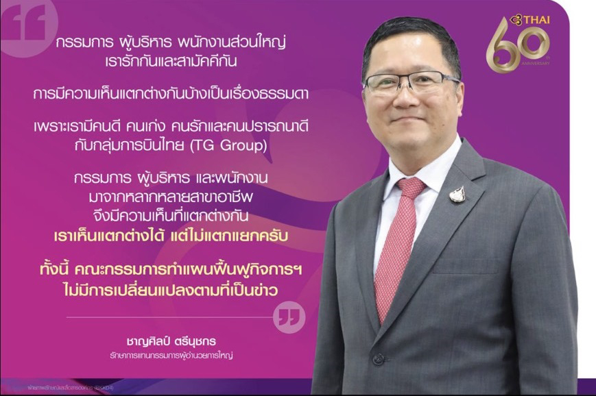 “การที่คณะกรรมการบริษัทฯ ฝ่ายบริหาร และพนักงาน มีความเห็นที่แตกต่างกันบ้างถือเป็นเรื่องปกติธรรมดา เพราะแต่ละคนมาจากหลากหลายสาขาอาชีพ และต่างมีความรู้ความสามารถ ก็อาจมีความคิดเห็นแตกต่างกันได้ แต่ไม่แตกแยก และทุกคนล้วนรัก มีความปรารถนาดีต่อการบินไทยทั้งสิ้น ซึ่งกรรมการบริษัทฯ ผู้บริหาร และพนักงาน มีความรักสามัคคี ร่วมมือประสานการทำงานกันเป็นอย่างดี รวมทั้งรับผิดชอบในหน้าที่ของตนเอง เพื่อให้การฟื้นฟูกิจการของการบินไทยประสบความสำเร็จตามเป้าหมายที่วางไว้” นายชาญศิลป์ระบุ