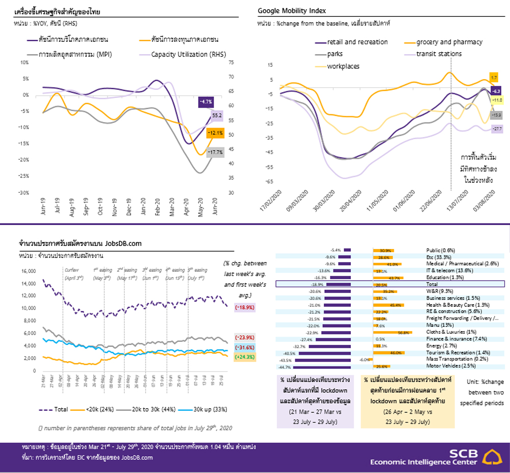 “ในช่วงที่เหลือของปี EIC คาดเศรษฐกิจไทยมีแนวโน้มฟื้นตัวอย่างค่อยเป็นค่อยไป ซึ่งจากข้อมูลล่าสุดพบว่าเศรษฐกิจไทยผ่านพ้นจุดต่ำสุดไปแล้วและกำลังฟื้นตัว อย่างไรก็ดี หากพิจารณาเครื่องชี้เร็วของ Google Mobility Index ในเดือนก.ค. พบว่าเริ่มเห็นสัญญาณการฟื้นตัวที่ช้าลงในช่วงหลัง เช่นเดียวกับข้อมูลจำนวนประกาศรับสมัครงานของ JobsDB.com ในเดือนก.ค. ที่พบว่าจำนวนประกาศรับสมัครงานเริ่มทรงตัวหลังจากที่มีการฟื้นตัวจากจุดต่ำสุด” EIC ระบุ