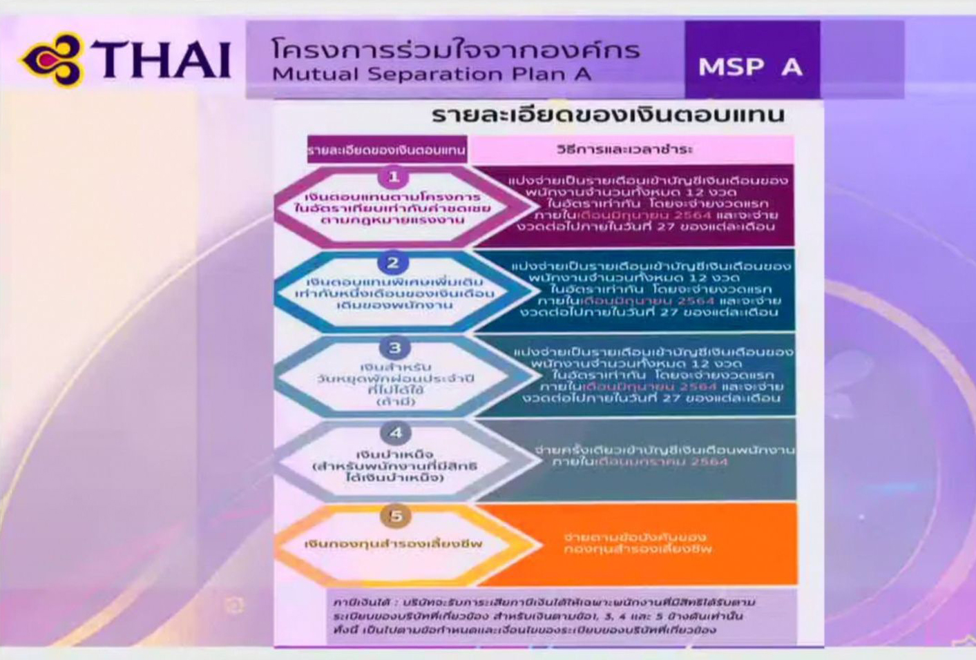 ส่วนรายละเอียดการจ่ายเงินนั้น ทั้งเงินตอบแทนตามโครงการในอัตราเทียบเท่ากับค่าชดเชยตามกฎหมายแรงงาน เงินตอบแทนพิเศษเพิ่มเติมเท่ากับ 4 เดือนของเงินเดือนเดิมของพนักงาน และเงินสำหรับวันหยุดพักผ่อนประจำปีที่ไม่ได้ใช้ (ถ้ามี) โดยเงินทั้ง 3 ส่วนจะนำมารวมกัน และแบ่งจ่ายเป็นรายเดือนเข้าบัญชีเงินเดือนพนักงาน 12 งวด ในอัตราเท่ากัน โดยงวดแรกจะจ่ายภายในเดือนมิ.ย.2564 และจ่ายงวดต่อไปภายในวันที่ 27 ของแต่ละเดือน