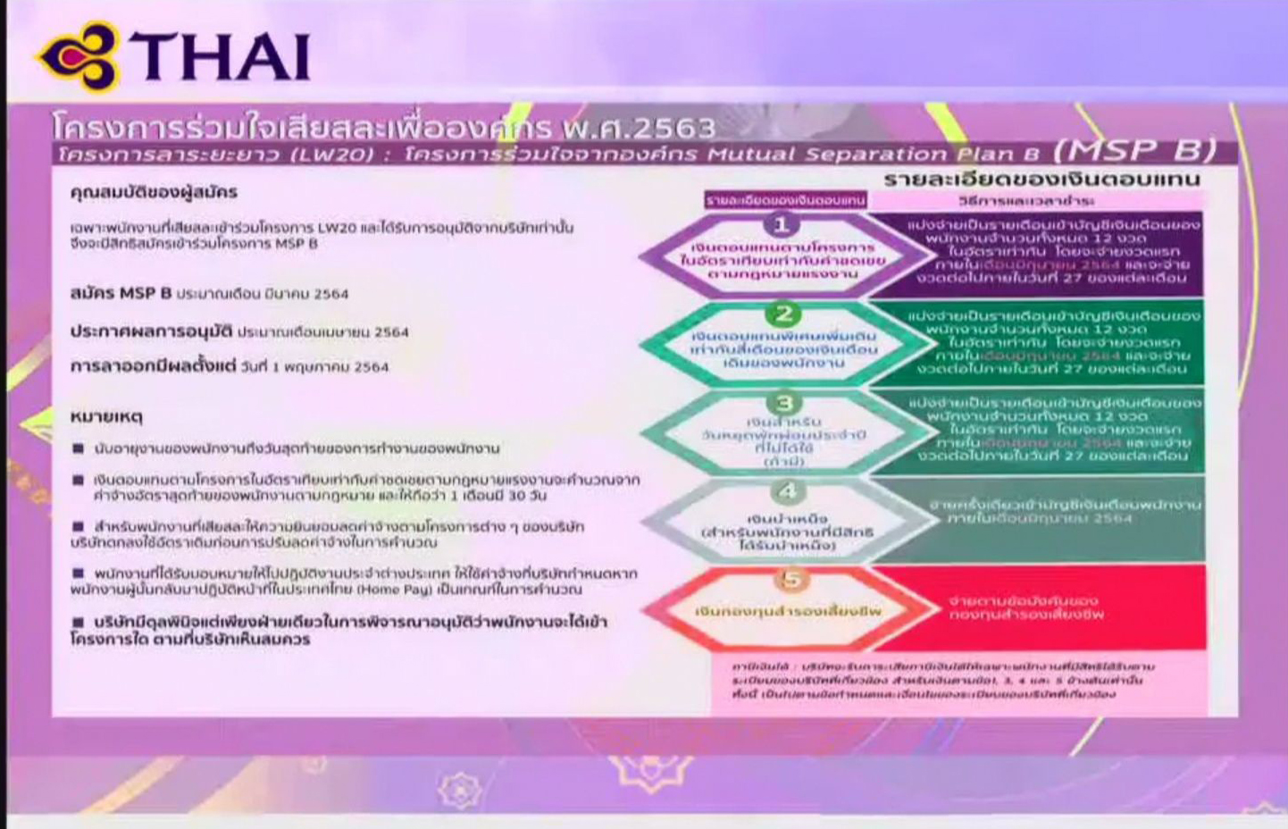 เฉพาะพนักงานที่เสียสละเข้าร่วมโครงการ LW20 และได้รับการอนุมัติจากบริษัทเท่านั้น จึงจะมีสิทธิสมัครเข้าร่วมโครงการ MSP B โดยการเปิดรับสมัครโครงการ MSP B ประมาณเดือนมี.ค.2564 ประกาศผลการอนุมัติประมาณเดือนเม.ย.2564 และให้การลาออกมีผลวันที่ 1 พ.ค.2564